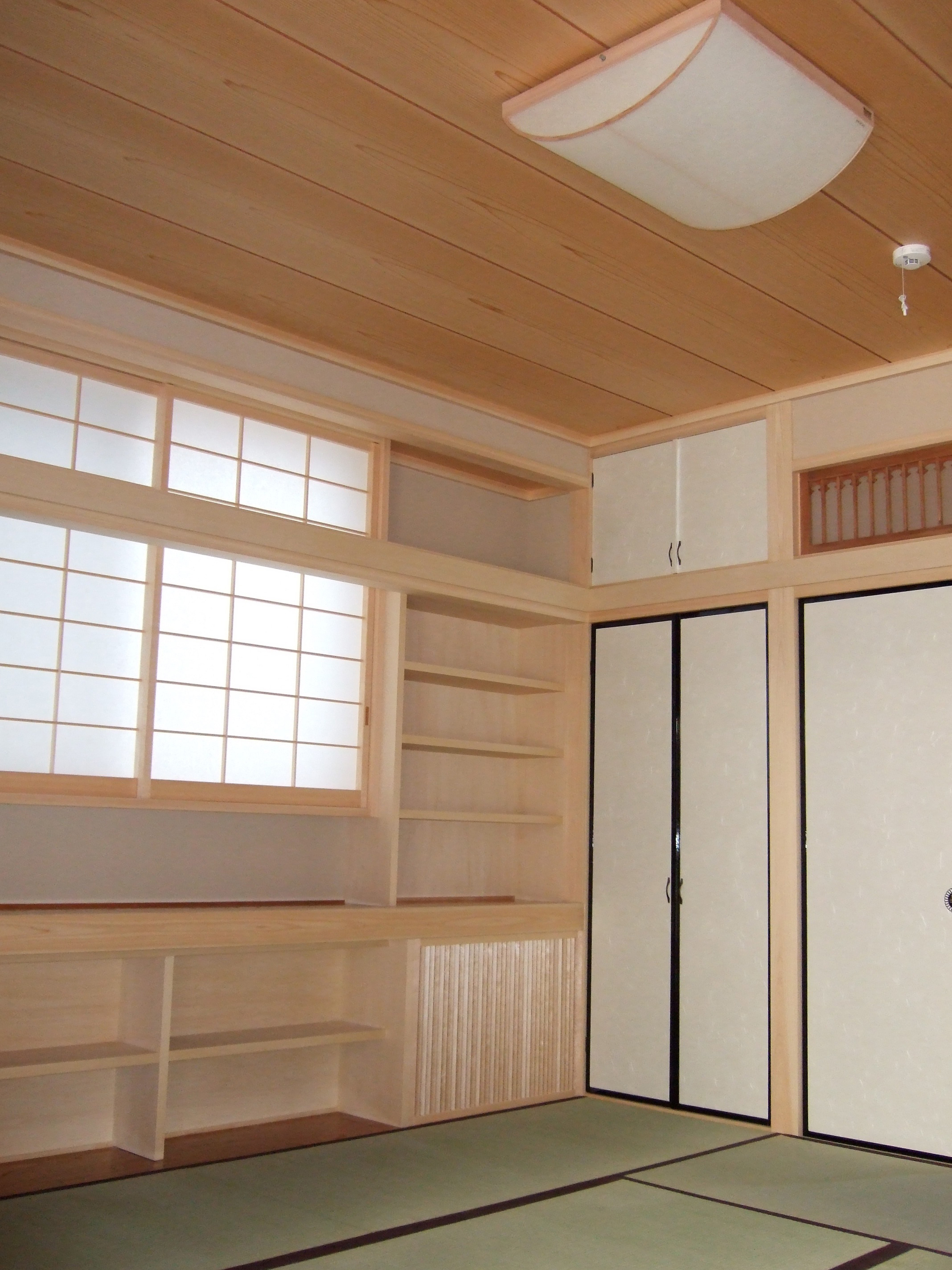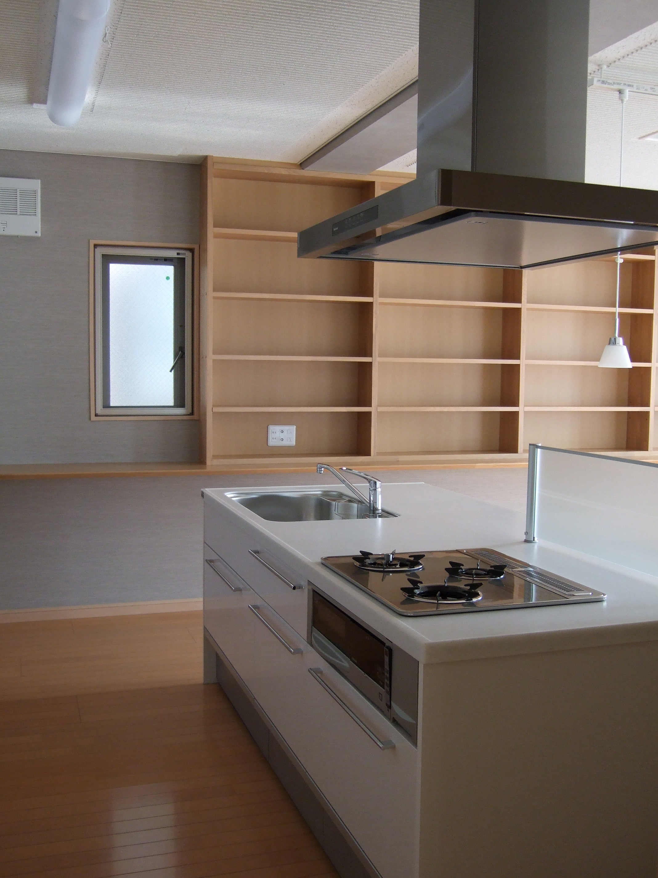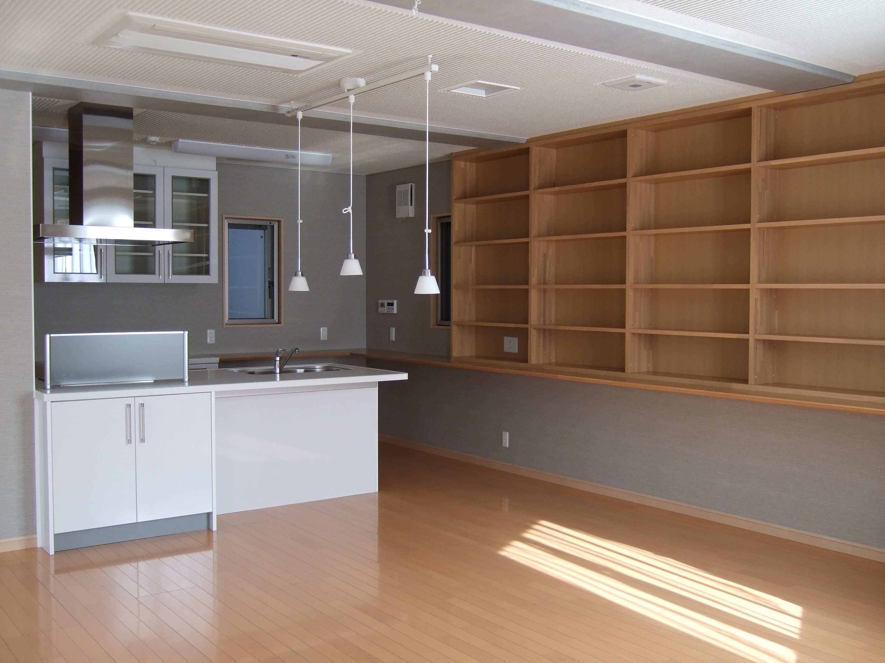 ダイニングキッチンには、備え付けの棚があり、食器や食材などをたっぷり収納できます。