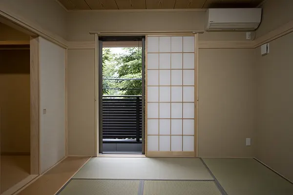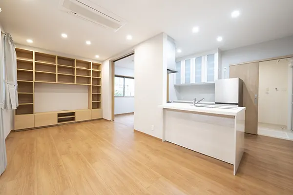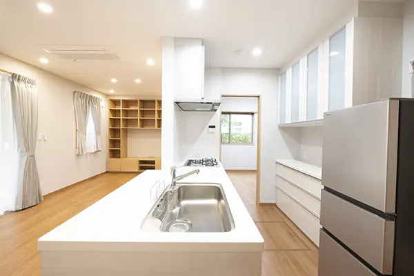 ご夫婦と息子様の3人でお住まいになる住宅です。水廻り、寝室、リビングを1階にまとめ、将来、ご夫婦が1階だけで生活ができるような間取りをご提案しました。 その反面、1階のリビングがコンパクトになってしまうので、空間を広く見せるように下記のような工夫をしました。 ・開放感のある対面キッチン ・洋室をリビングと続き間して一体化 ・天井高さは2.5m ・埋込の照明やエアコンを使用 将来、太陽光発電を乗せられるようにしたいというご希望もあり、屋根を南側に向けて片流れにした事から、2階はロフトと小屋裏収納を作る事もご提案しました。 洋室はロフト収納ができるだけでなく、天井も高く、ゆったりとした空間となりました。 また、こちらの敷地は豊島区の不燃化特区かつ防災生活道路沿いにある敷地のため、準耐火建築物で施工し、助成金の対象となりました。