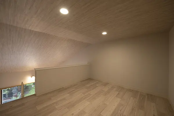 将来、太陽光発電を乗せられるようにしたいというご希望もあり、屋根を南側に向けて片流れにした事から、2階はロフトと小屋裏収納を作る事もご提案しました。