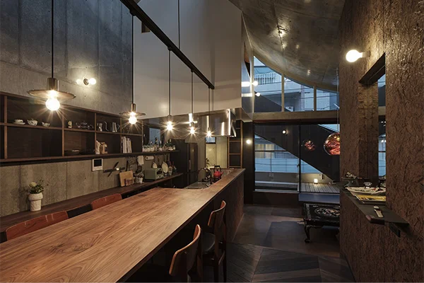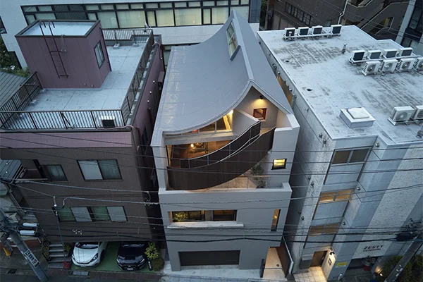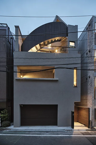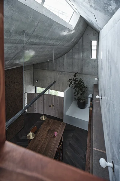設計は、あおいも様、施工を弊社で請け負いました。 曲線の大屋根が特徴的で、室内側も打ち放し仕上げのため、型枠やコンクリートの打ち込みに大変苦労しました。 まず、3階から屋根までのコンクリートを1日で打ち込むのは厳しいため、吹き抜け部分に仮のスラブを作り、打ち込みを2回に分けました。 次に、曲線部分のコンクリートをどう流し込むかを検討した結果、型枠に何箇所も穴を開け、そこにバイブレーターを入れ込み、コンクリートの充填を確認したうえで、穴を塞ぎながら打ち込む方法としました。 打ち込みの際、仮スラブから屋根の低い部分は、寝そべるくらいのスペースしかありませんでしたが、その中に潜り込み、コンクリートがうまく流れるよう下部からも型枠をたたき込み、写真のような仕上がりとなりました。