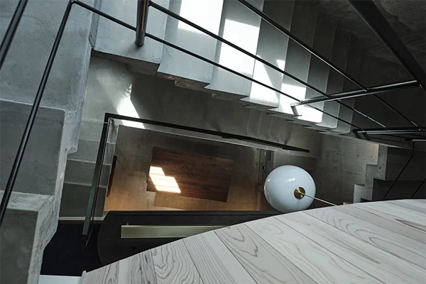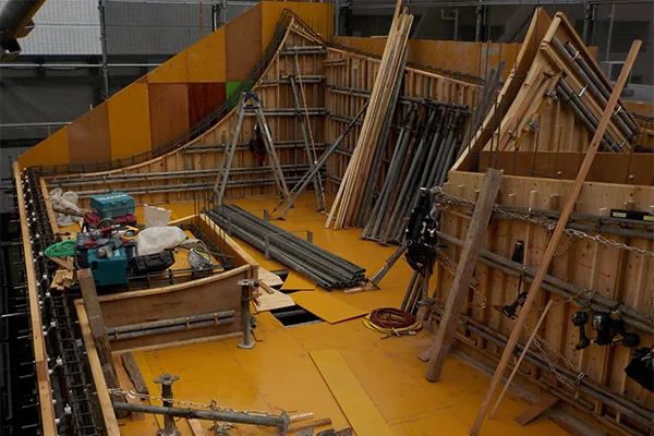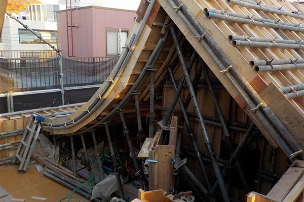 まず、3階から屋根までのコンクリートを1日で打ち込むのは厳しいため、吹き抜け部分に仮のスラブを作り、打ち込みを2回に分けました。