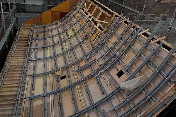 曲線の大屋根が特徴的で、室内側も打ち放し仕上げのため、型枠やコンクリートの打ち込みに大変苦労しました。