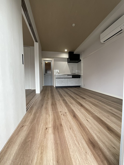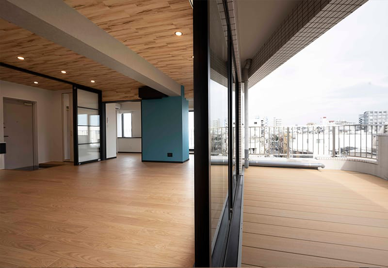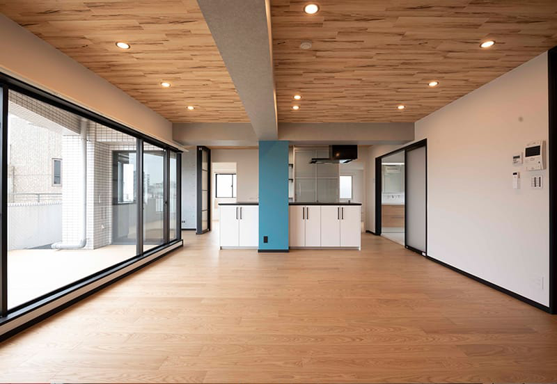無駄な空間であった廊下を無くし、天井はコンクリートの梁をそのまま見せることでLDKを広く感じさせるようにしました。
