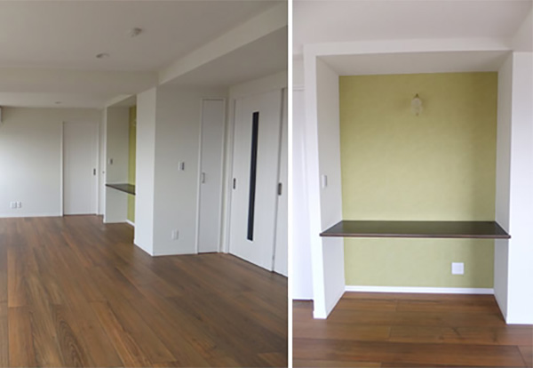 キッチン前のダイニングスペースだった部分をテレワークスペースにしました。家事スペースや子供の学習スペースとして使用しても良いと思います。