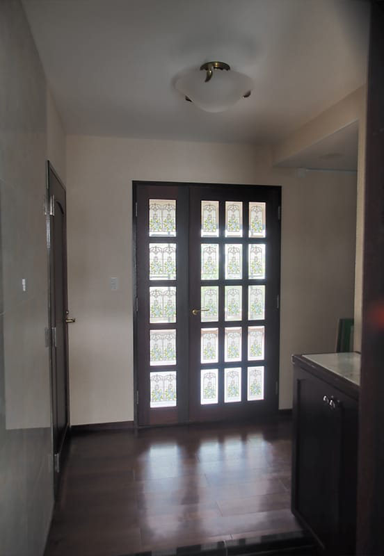 日当たりの良いリビングの採光を玄関にも取り入れるように大きなガラス戸にしました。