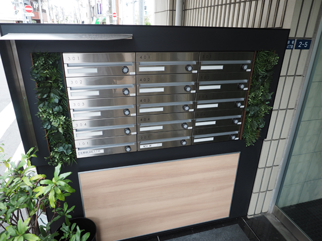 集合ポストの老朽化で開閉がしづらくなったため、ポストの内部が見えにくいタイプのポストに取り替えました。既存ポストと新しいポストのサイズが異なってしまうので、隙間を利用して造花を設置、周囲のタイル部分も化粧パネルを貼り、イメージを一新しました。