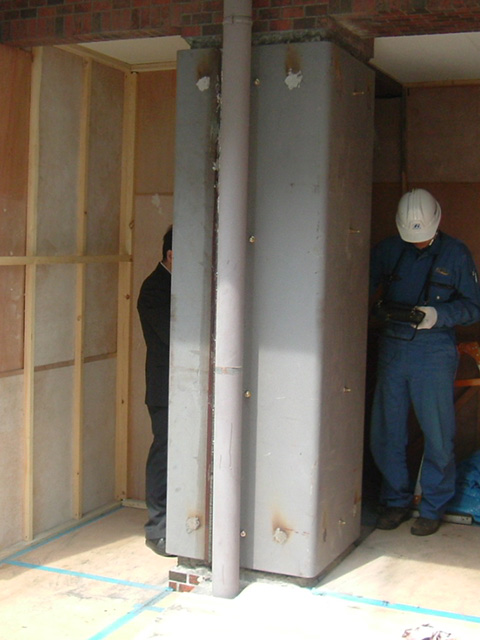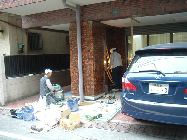 旧基準で建てられた鉄筋コンクリート造の1階の柱を耐震補強しました。 既存タイルを剥がし、鉄板で柱を巻き、最後にタイルで仕上げるという方法です。