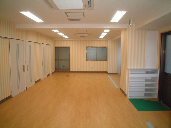 間仕切り変更で大空間が出来ましたので、省エネ型のLED照明設備を入れて室内の隅々まで暗くないよう、また壁やクローゼットを新規にオフホワイトで統一し、床も明るい色調に張り替えることで、大勢の人々の顔が元気良く見えて安心で動きやすく、使いやすいデイホームになりました。